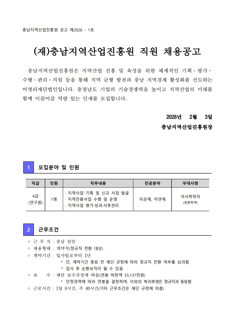 [공고 제2026-1호] (재)충남지역산업진흥원 직원 채용공고